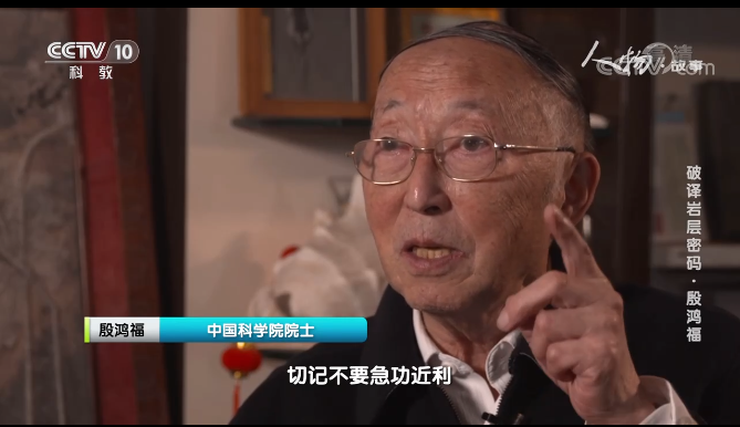殷鸿福院士在节目中寄语科研工作者和老员工,“学术上不盲从,不随大流,敢于挑战权威”,“不要怕失败,失败了再来”,“搞科学研究、治学,切记不要急功近利”。