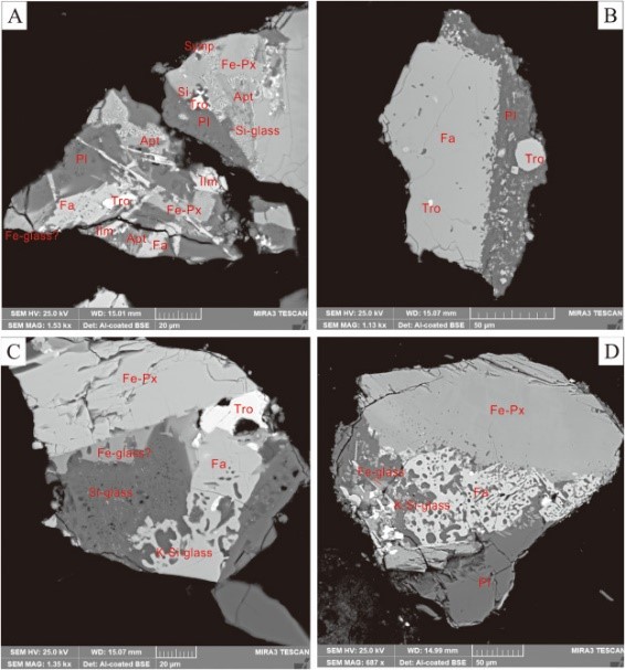 玄武岩碎屑以次辉绿结构为主,无斑晶或少斑晶,低钛至中钛 (2.1-5.5 wt%),低Mg# (19 - 47,平均为33)。此次研究还发现了一系列高度演化的玄武岩碎屑,其含丰富的铁橄榄石、后成合金,可见富Si的熔体与铁橄榄石和铁辉石共生的岩浆晚期硅酸盐液体不混溶结构(图2)。结合这些特征及实验岩石学结果,反映出玄武岩碎屑经历了高程度的分离结晶过程。