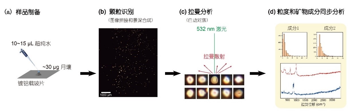 图1 用拉曼光谱自动微颗粒分析技术同时测定月壤粒度和矿物组成的流程