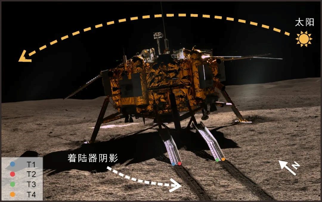 着陆在月球背面的嫦娥四号着陆器。彩色圆点分别指示四个温度计(T1-T4)的位置