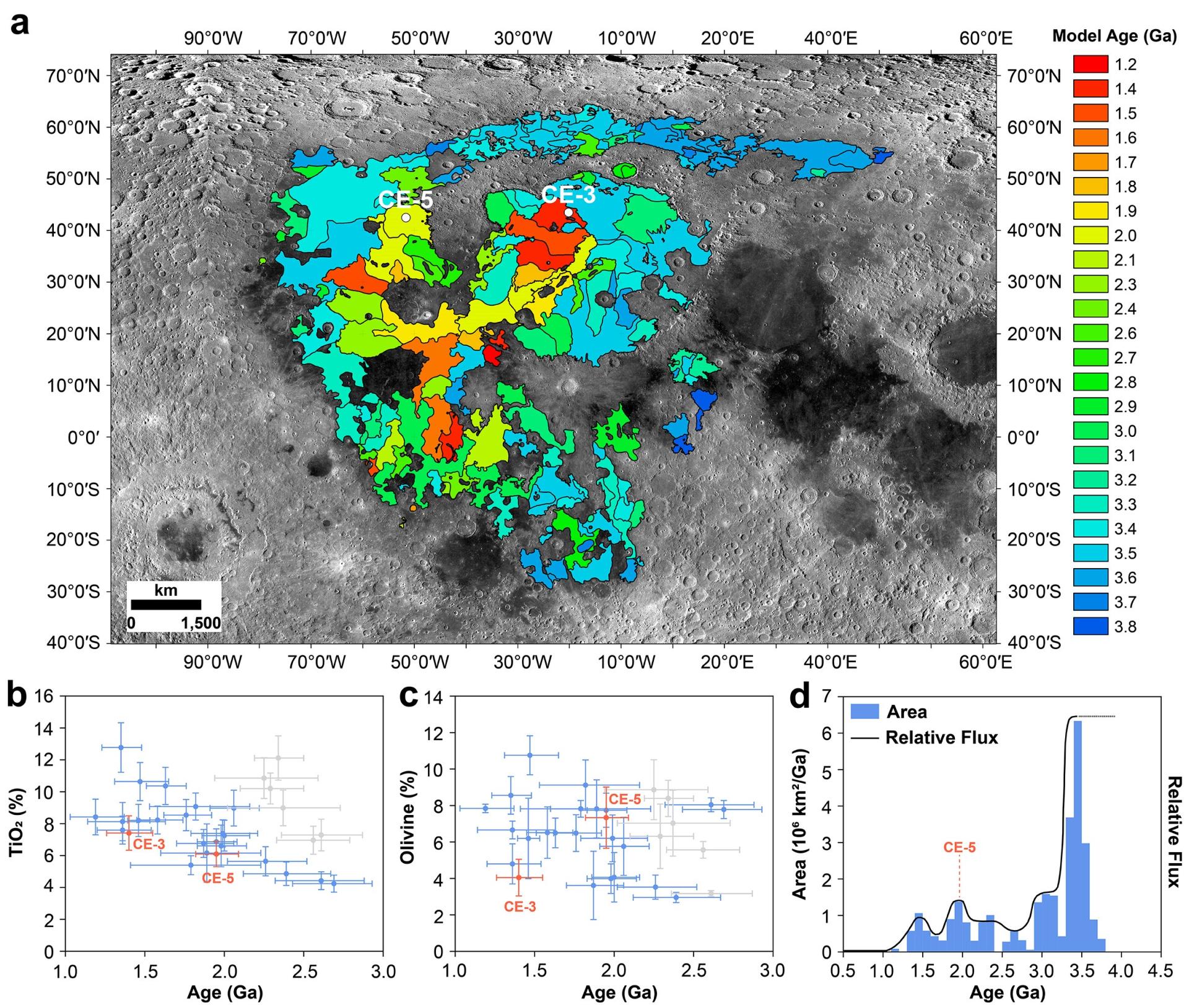 年轻月海玄武岩是月球近期(30亿年以来)火山活动的产物,蕴含月球晚期热演化及月球如何逐步走向死寂的奥秘。我国嫦娥三号对雨海北部的年轻玄武岩单元进行了探测,而嫦娥五号更是直接从风暴洋北部地区采集到了距今20亿年左右形成的玄武岩样品,为我们认识月球晚期火山活动提供了可能。公司行星所科研团队基于嫦娥三号和嫦娥五号任务提供的宝贵地面真值,对全月年轻火山活动进行了研究,重新解译了它们的物质组成并校正了各火山单元的年龄。相关成果发表在《自然·天文学》上,第一作者为beat365官网中文(武汉)钱煜奇、佘振兵、何琦,通讯作者为肖龙、汪在聪。
