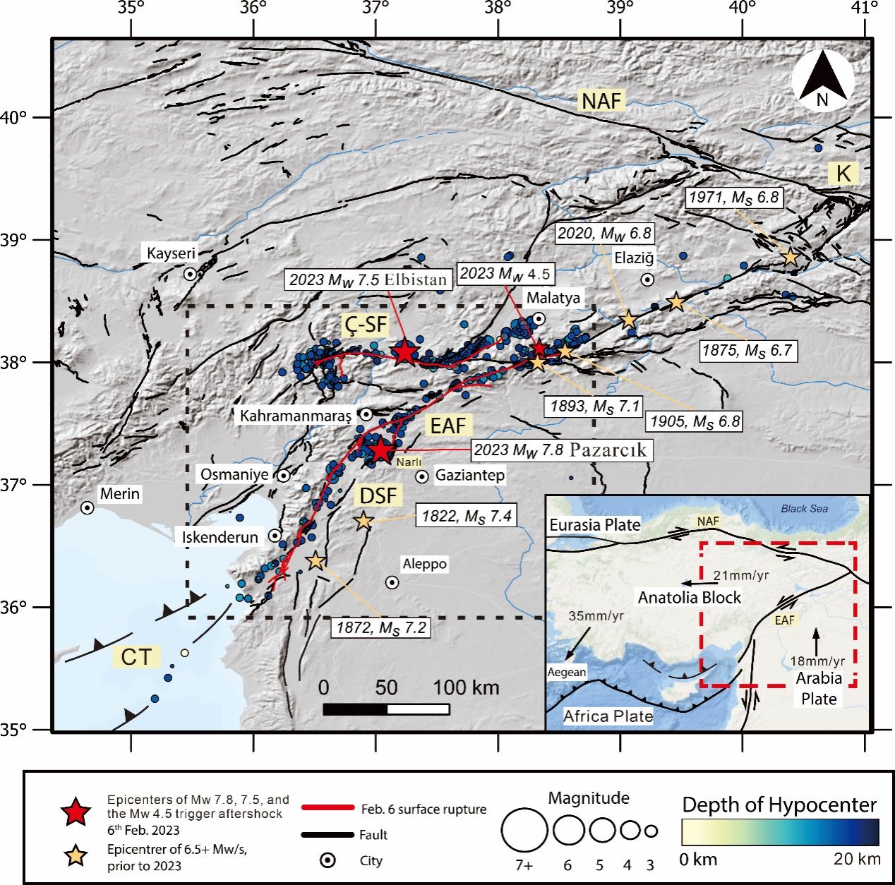 此前,研究团队对2020年10月发生在土耳其安纳托利亚板块西部罕见的Mw 7.0伸展型地震也开展了相关研究,通过野外工作获得重要新构造活动断层的运动学数据,结合地球物理研究提出,Mw 7.0地震事件是在大洋向大陆板块俯冲汇聚板块边界,俯冲的板块发生回撤背景下造成的上盘伸展型地震,整个区域地表构造以南北向伸展为特征(Meng et al., 2021)。而本次发生在安纳托利亚板块东部地震事件,处于大陆向大陆碰撞的汇聚板块边界,是挤压和走滑共同作用的背景下发生的地震。是在北向运动的阿拉伯板块与欧亚板块碰撞、安纳托利亚板块侧向挤出这一构造背景下,死海断层带(DSF)和东安纳托利亚断层带(EAF)两条重要的转换型板块边界及其分支在板块构造运动的背景下共同活动导致的(图1)。本研究开展的实地勘察结果、美国地质调查局的地震数据和卫星图像数据共同揭示,M7.8级地震震中位于死海断层北部尽头的Narlı段,震后地表形成2-2.5m的位移。震后24秒钟,破裂向北部传播到应力积聚已达上百年的东安纳托利亚断层,激活了整条东安纳托利亚断层带,导致地表产生长达350km的破裂带,并引发大量余震。值得注意的是,两条断层的交汇处测得的地表位移为6.7m,是整个地震区域实测地表位移的最大值。随后,破裂自交汇处向东安纳托利亚断层两侧不断传播,位移错动值也向两侧逐渐递减(图2),约9小时后,一个位于东安纳托利亚断层带与Çardak-Sürgü (Ç-SF)断层带交汇处的余震事件,诱发了第二次Mw7.5地震事件,同时激活了整条Çardak-Sürgü fault断层带,形成了约110km的地表破裂,并在该断层带上再次诱发大量余震。