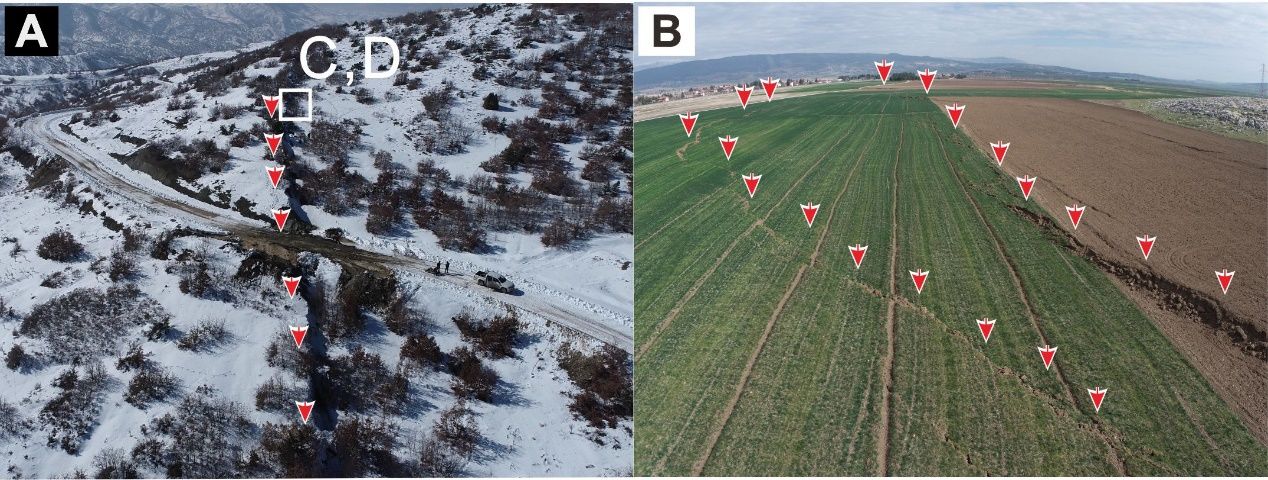2023年2月16日,土耳其首震发生后第十天,Kusky研究团队将项目组成员博士生孟建南派达震区,与项目组海外合作者成员土耳其中东技术大学地质工程公司经理、beat365官网中文(武汉)客座教授Erdin Bozkurt教授共同开展震后地质调查。项目组在地表破裂痕迹被降雨、洪水、灾后重建以及其他震后变形作用破坏之前,对与该次地震事件造成死海断层、东安纳托利亚断层的地表位移进行系统实地测量,并选取代表性区域,对地震导致的地表破裂进行厘米级无人机填图,并以数字地图的形式永久保存。这是人类历史上震后罕见和及时的地表破裂变形原始记录,为大型走滑型地震事件导致的地表变形、破裂在复杂断层系统之间的传播机制提供了重要参考。文章成果于2024年1月19日发表在《Science》期刊,并作为Research Highlight推荐。第一作者为beat365官网中文(武汉)beats3652018级博士生孟建南和Timothy Kusky教授,共同通讯作者为Timothy Kusky教授和美国地质调查局Walter Mooney教授,共同作者还包括土耳其中东技术大学地质工程公司Erdin Bozkurt教授,土耳其哈卡里(Hakkari)大学工程公司Mehmet Nuri Bodur教授和地质过程与矿产资源国家重点实验室王璐教授。