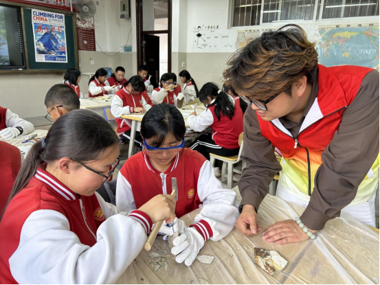 在科普讲座后的化石修复环节,同学们全副武装,佩戴好护目镜、戴好手套,自己动手,让千万年前的化石终得以再见天日,看着自己从岩石里“敲”出来的鱼化石都非常欣喜。在探索过程中,孩子们亲手体验观察、清灰、开凿等一系列化石发掘的流程,化身小小“考古家”,在实践中与数亿年前的生命对话,感悟生命演变的秘密。