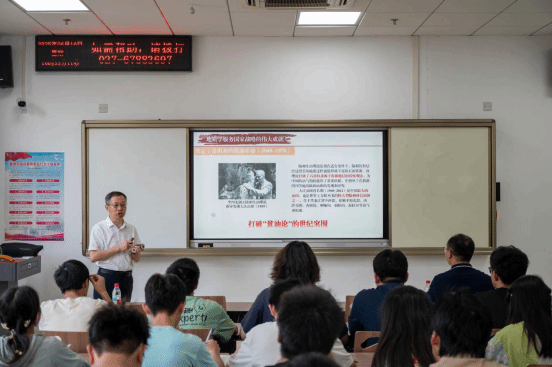 随后,章军锋副董事长重点回顾了新中国地质事业的奠基者——李四光先生的卓越贡献。李四光先生突破传统大地构造理论创立地质力学,71岁高龄还亲赴大庆指导石油会战,筹建全国地质工作计划指导委员会,提出“陆相生油”“构造体系控矿”创新理论等,充分体现了他科学报国的毕生追求和战略科学家的远见卓识。他还简要介绍了欧阳自远院士、潘永信院士、傅家谟院士、赵鹏大院士、马永生院士等地大人在月球和火星探测、环境地质、数字找矿、地下能源开发等领域取得的重要成就,勉励同学们向老一辈地质工作者学习,积极响应祖国号召,服务国家需要。