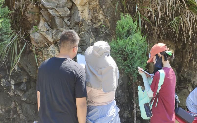 在前一天安排下,安全员提醒大家轮流在太阳下工作,每半小时及时到阴凉处休息补水和及时就餐,防止中暑。同学们工作非常认真,露头上的暴晒不到一分钟就开始汗流浃背,但丝毫没有影响到大家的工作热情,大部分小组当天就对工作区的填图工作完成了近80%。尤其是大一的同学,尽管专业知识没有大二、大三接受得多,但他们在露头上坚守的时间最长,老师和安全员数次提醒他们到阴凉处休息都迟迟不肯离开露头。同学们的午餐在露头上快速解决后,又及时返回露头开始工作。