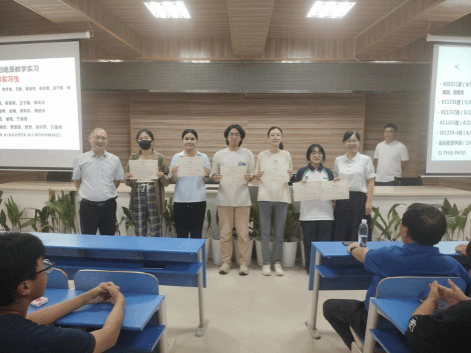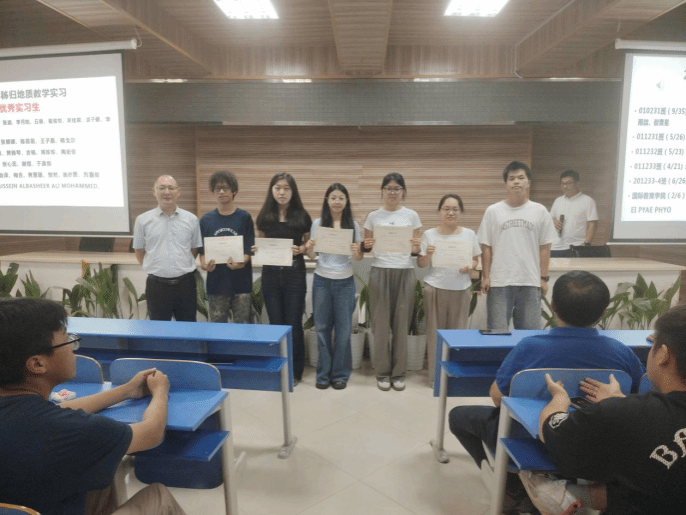 在表彰环节,大会对三个公司各班级的优秀实习生及三位优秀实习教师进行了表彰,以嘉奖他们在实习中的突出表现与责任担当。尤为值得关注的是,现场特别向颜佳新老师颁发秭归 “终身成就奖”,致敬其在地质实践教学领域的长期坚守与卓越贡献。