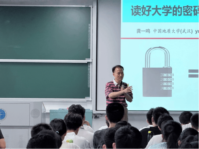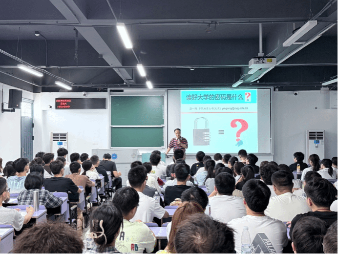 在互动环节,同学们踊跃提问。同学们就“如何平衡学业与社团活动”“怎样培养跨学科思维”“地学人的未来发展路径”等问题踊跃提问,其中一名同学就“如何处理短期利益与长期目标之间的关系”向教授请教。龚一鸣以“篮球架定律”作比喻回应道:“目标设定要像篮球架高度,既不能太高难以实现,也不能太低缺乏挑战。短期利益应服务于长期目标,用长期目标导航短期选择,在‘跳一跳够得着’的过程中实现阶梯式成长。”这一精彩解答赢得了全场掌声。