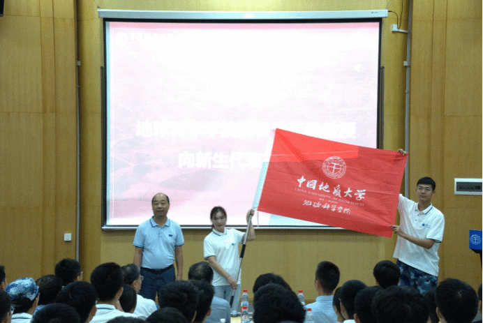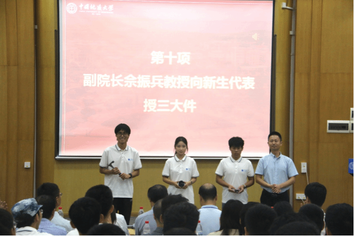 副经理佘振兵教授向新生代表授予“地质三大件”