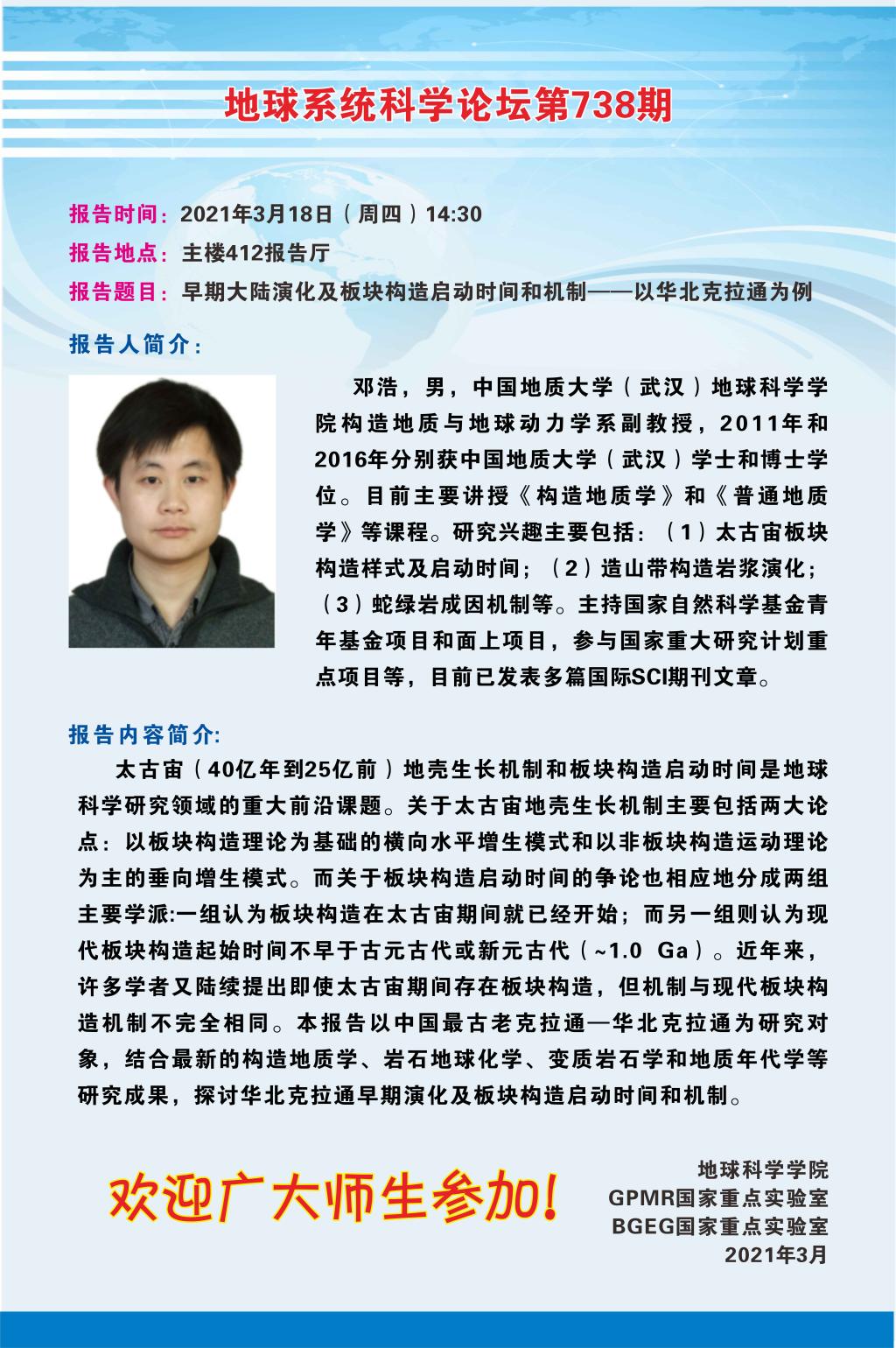 【3月18日】邓浩:早期大陆演化及板块构造启动时间和机制——以华北克拉通为