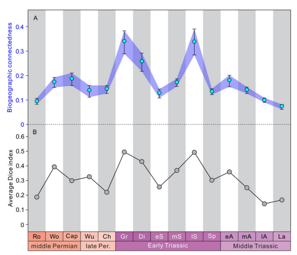 该研究首次提出了三种机制来解释生物全球化(图 2):1)地方种的选择性灭绝;2)地方种变成广布种;3)新生出广布种;并利用两种生物地理网络计算方法对中二叠世-中三叠世的全球菊石地理分布数据进行分析。