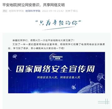 七、增强网络安全意识。广泛开展网络安全意识宣传,10月23日,安全保卫部副部长彭冠军老师以“平安校园你我同行”为主题为公司员工干部作防范电信网络诈骗安全培训,分析了当前校园反诈的严峻态势,介绍了校园常见的网络诈骗类型,叮嘱同学们增强法律和防范意识,谨防电信网络诈骗。国家网络安全学习周时期,发布《平安地院|树立网安意识,共享网络文明》推文,系统总结国家网络安全课内容,利用员工喜爱的平台及方式方法持续开展网络安全意识宣传。