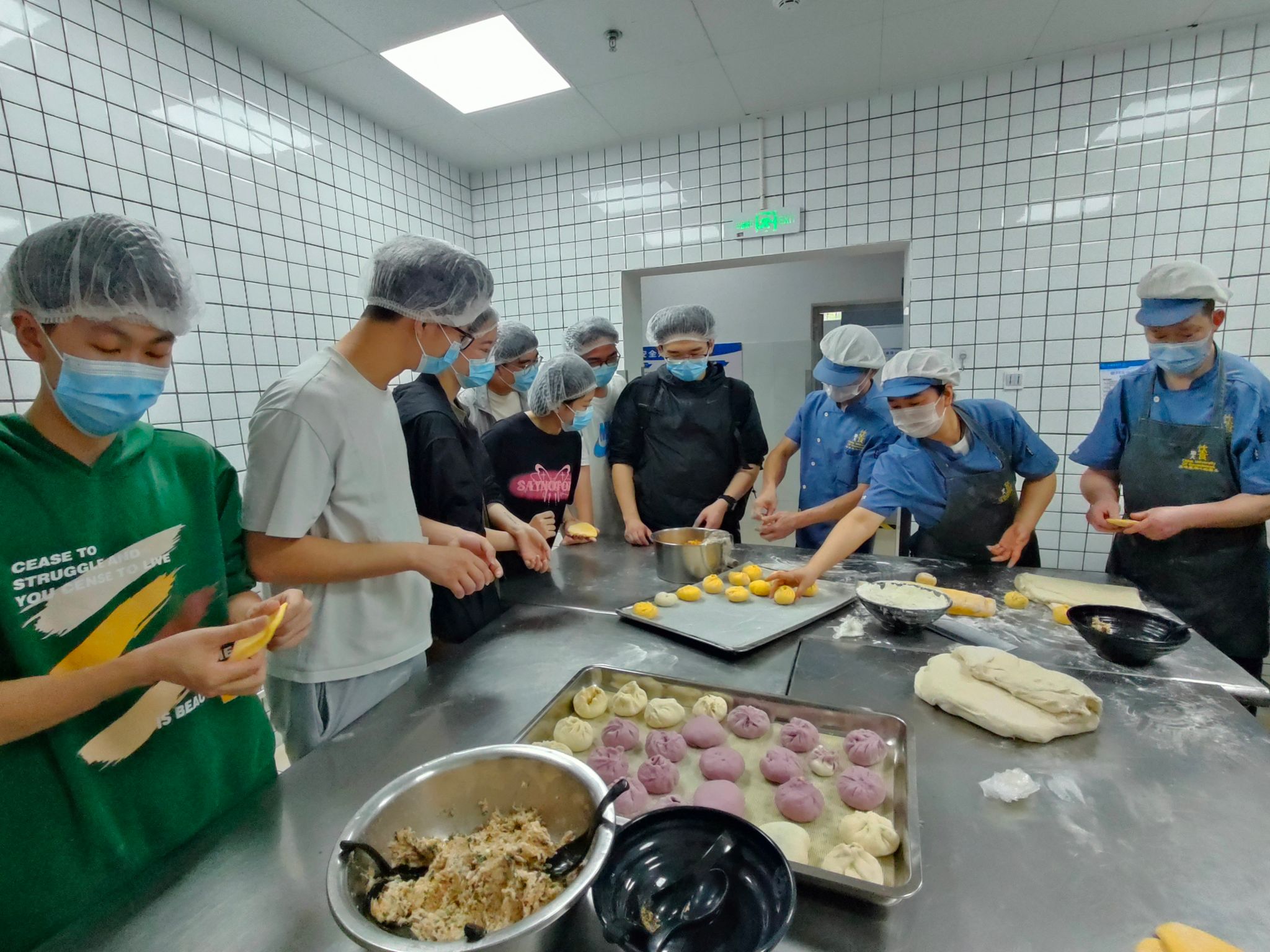 交流讨论结束,洗净双手后,大家一起前往北区食堂操作间,开展面点制作现场教学。面点师傅向员工们展示了面点的制作过程,并邀请辅导员滕笑丽老师以及员工们动手尝试。同学们热情地卷起袖子,投入到了面点制作之中。他们的动作熟练而充满个性——擀面皮、填馅料、捏造型……每一道工序都充满了欢声笑语。经过大家的共同努力,餐盘上摆满了形状各异、色彩斑斓的包子,不仅承载着饮食服务中心对同学们深深的关怀,更是装满了同学们的欢乐与满足,让人心中涌动着温馨的感动。