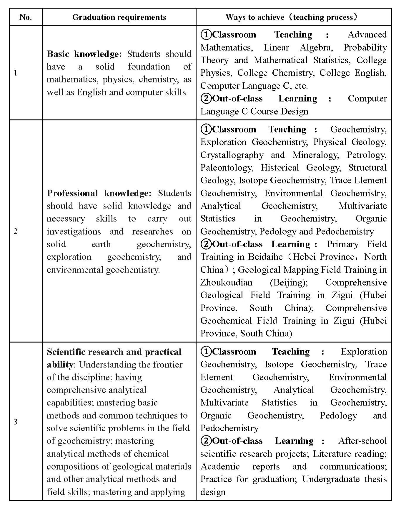 Practical Work: Primary Field Training in Beidaihe(Hebei Province,North China); Geological Mapping Field Training in Zhoukoudian (Beijing); Comprehensive geological Field Training in Zigui (Hubei Province, South China); Comprehensive Geochemical Field Training in Zigui (Hubei Province, South China); Professional Field Training; Computer programming; Practice for Dissertation.