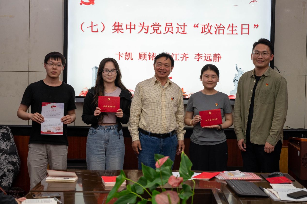 在活动的最后马昌前教授和秦傲老师为当月入党的党员们颁发纪念卡,庆祝他们的“政治生日”。 主题党日上,全体党员还开展了中央八项规定精神问题查摆和知识自测,并足额缴纳了4月党费。